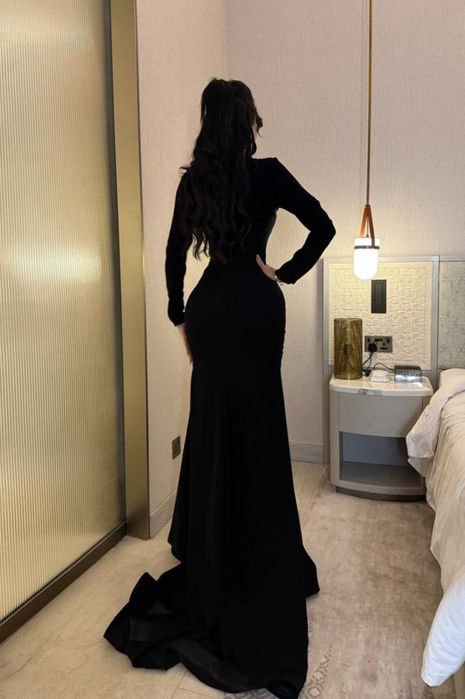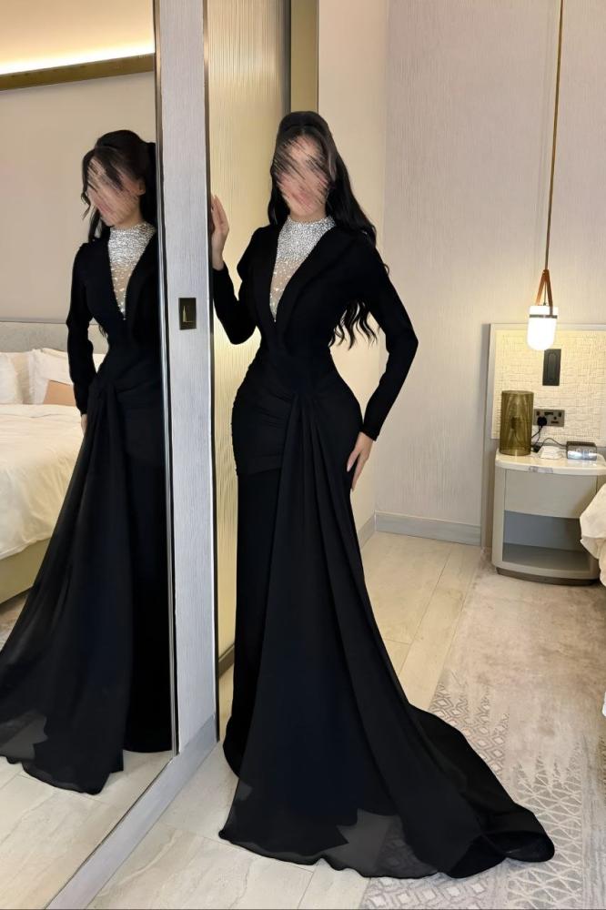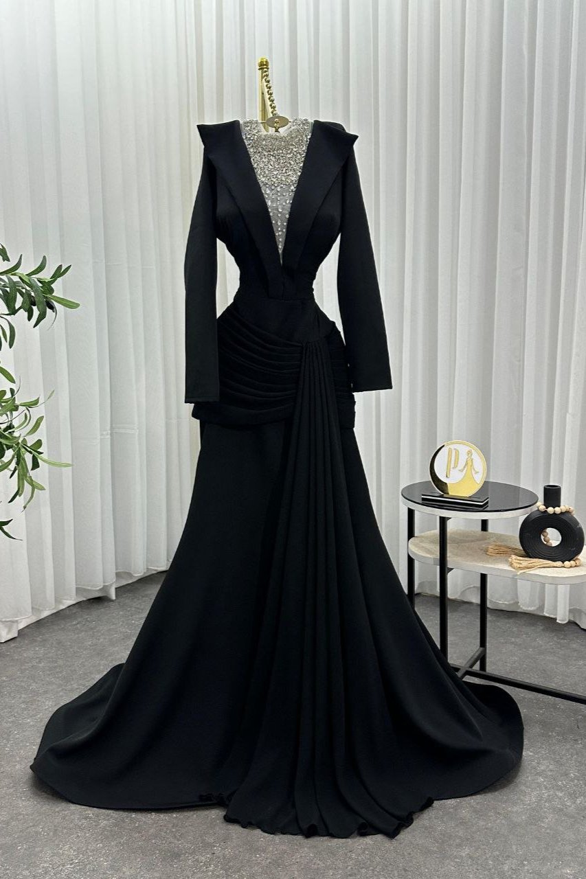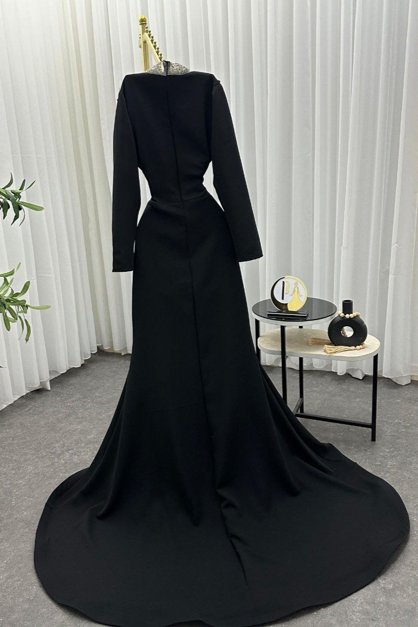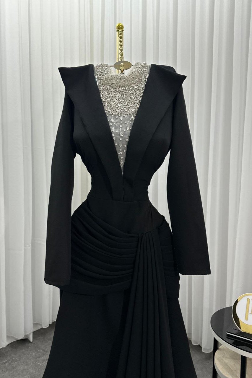فستان سهرة أسود طويل بياقة مرصعة بالكريستال
