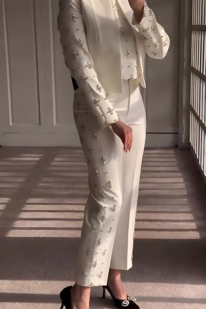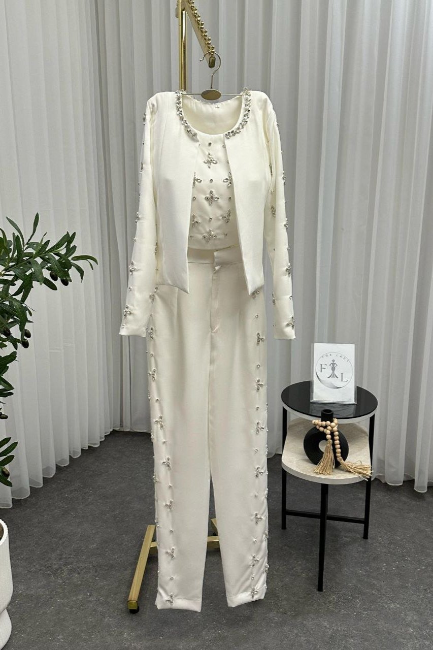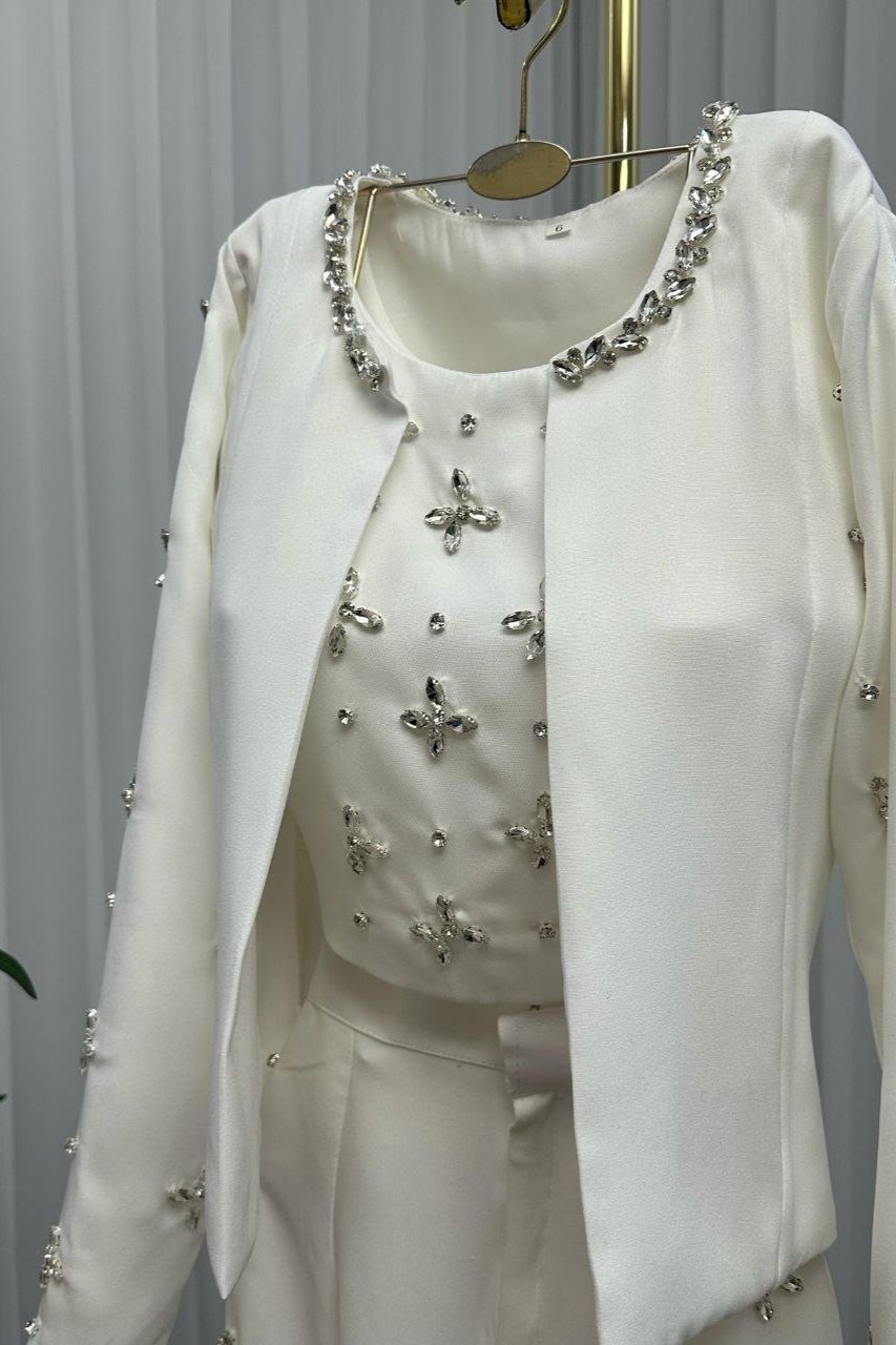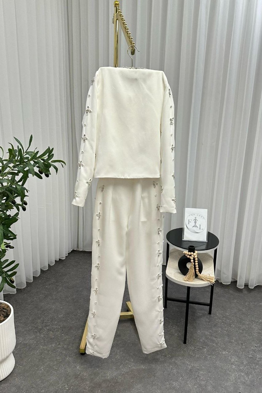 استمتعي بأناقة استثنائية مع هذا الجمبسوت الأبيض الفخم، المصمم بتفاصيل تطريز براقة على الأكمام والسروال ليمنحك لمسة راقية