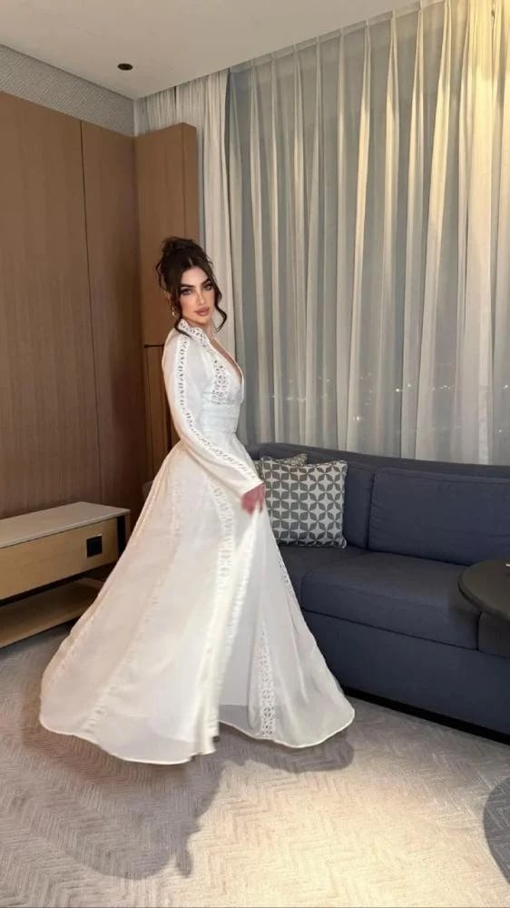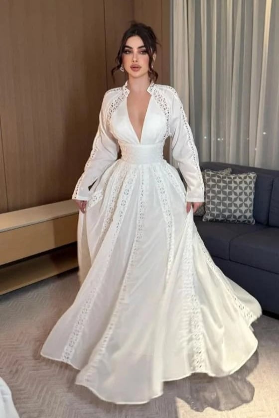 فستان أبيض طويل بأكمام دانتيل أنيقة