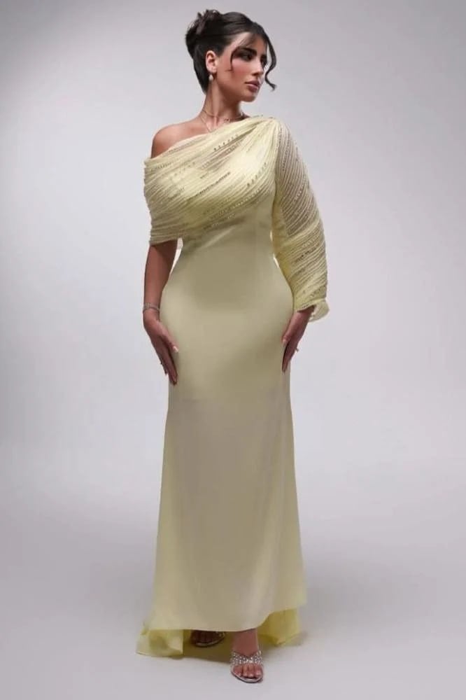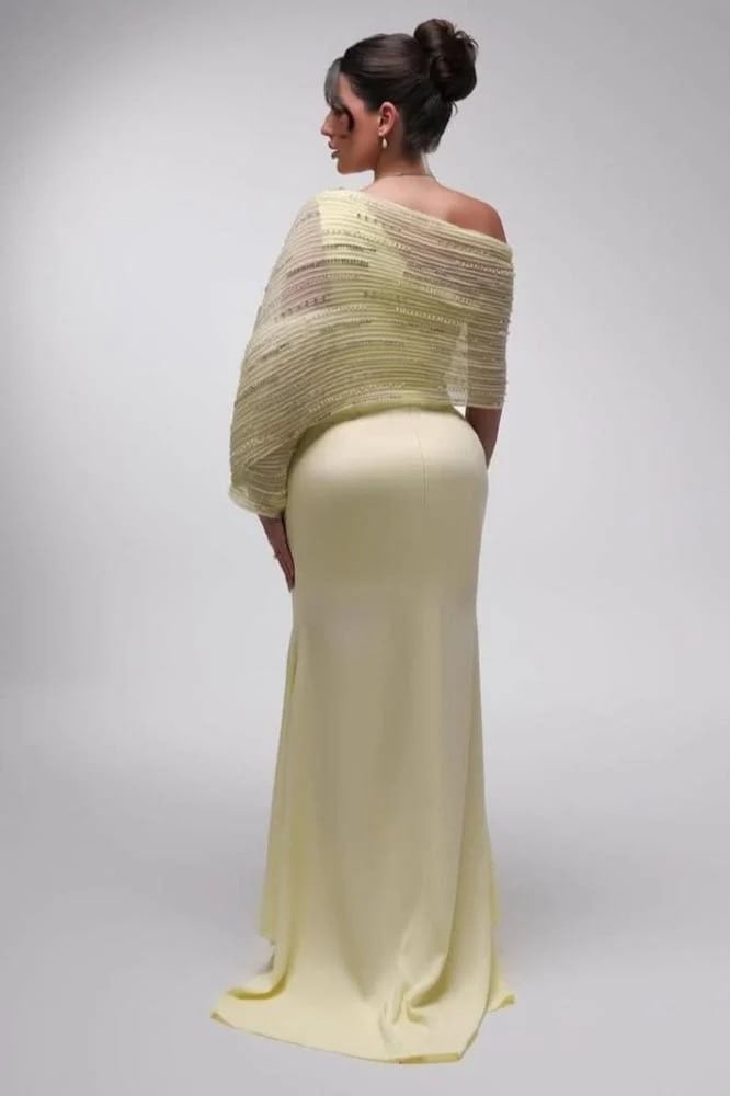 فستان سهرة أصفر فاتح بقصة ضيقة مع شال كتف مطرز