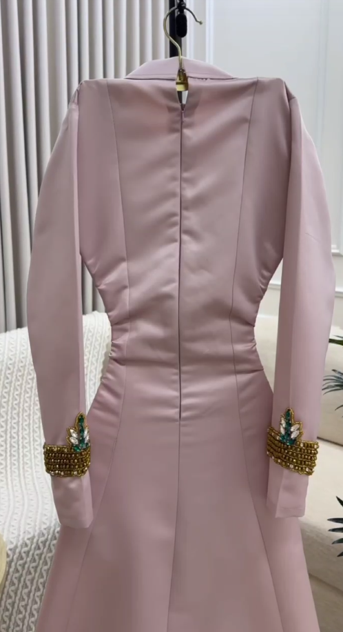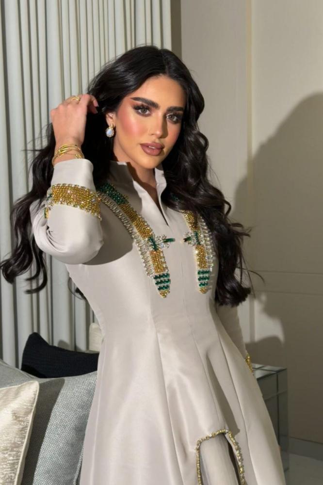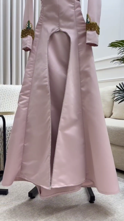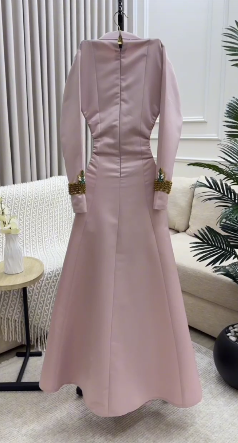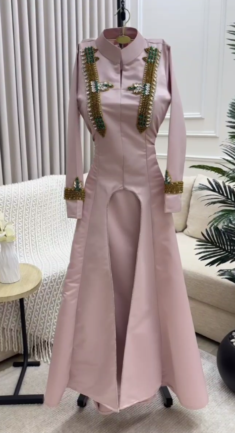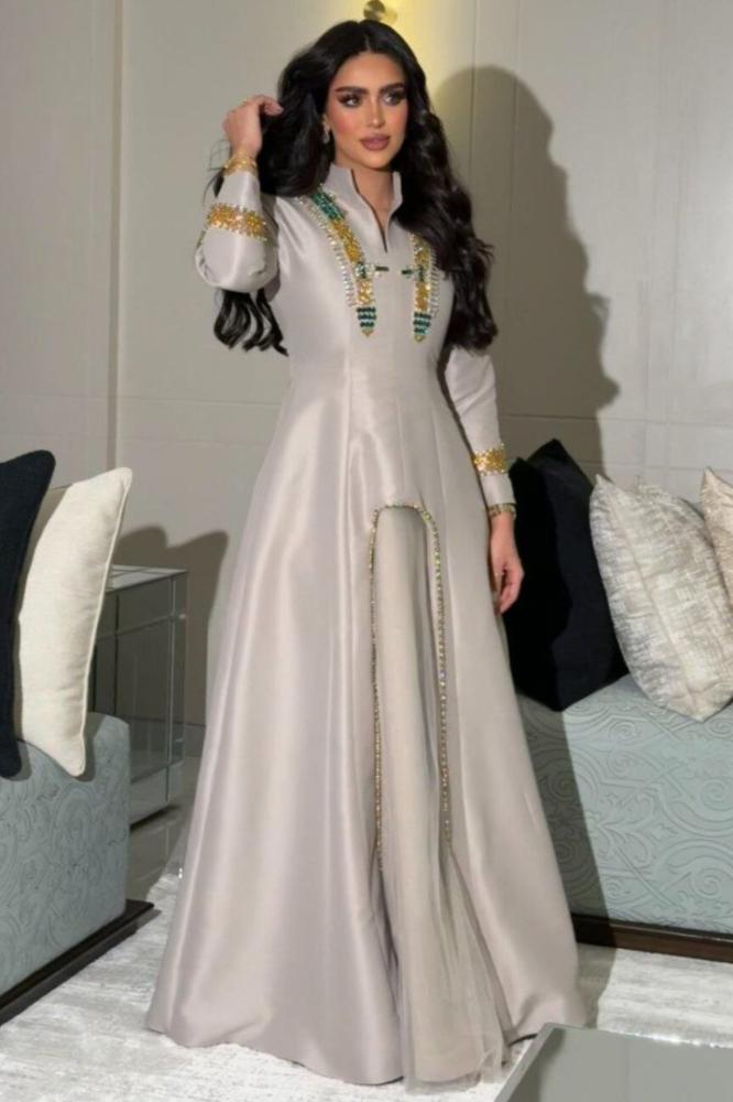 فستان طويل بقصة واسعة وانسيابية. يتميز بياقة مفتوحة وأكمام طويلة مزينة بتطريز يعزز من أناقته.