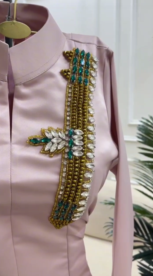 يزين منطقة الصدر تطريز هندسي متناسق مع تفاصيل لامعة على طول الفتحة الأمامية