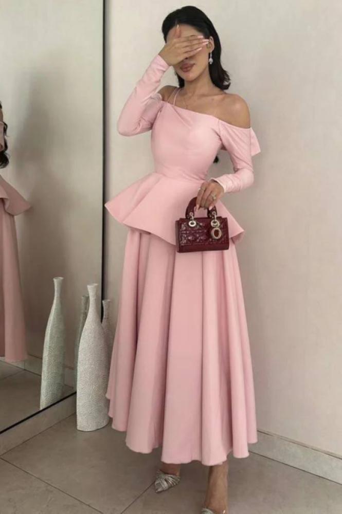 فستان وردي أنيق بتصميم راقٍ وجذاب، يتميز بأكمام طويلة وأكتاف مكشوفة تضفي لمسة أنثوية راقية.